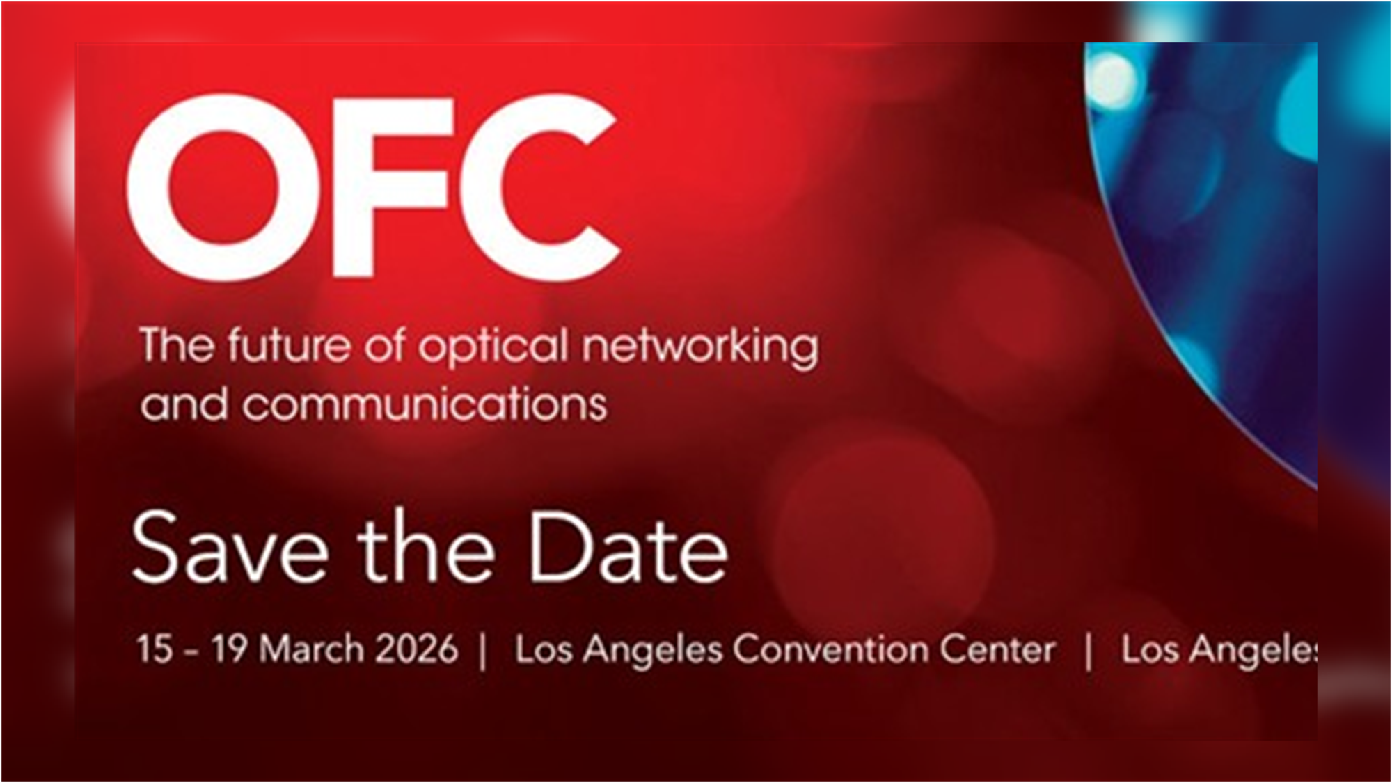 OFC 2026 will take place March 15–19, 2026, at the Los Angeles Convention Center, with the exhibition running March 17–19.